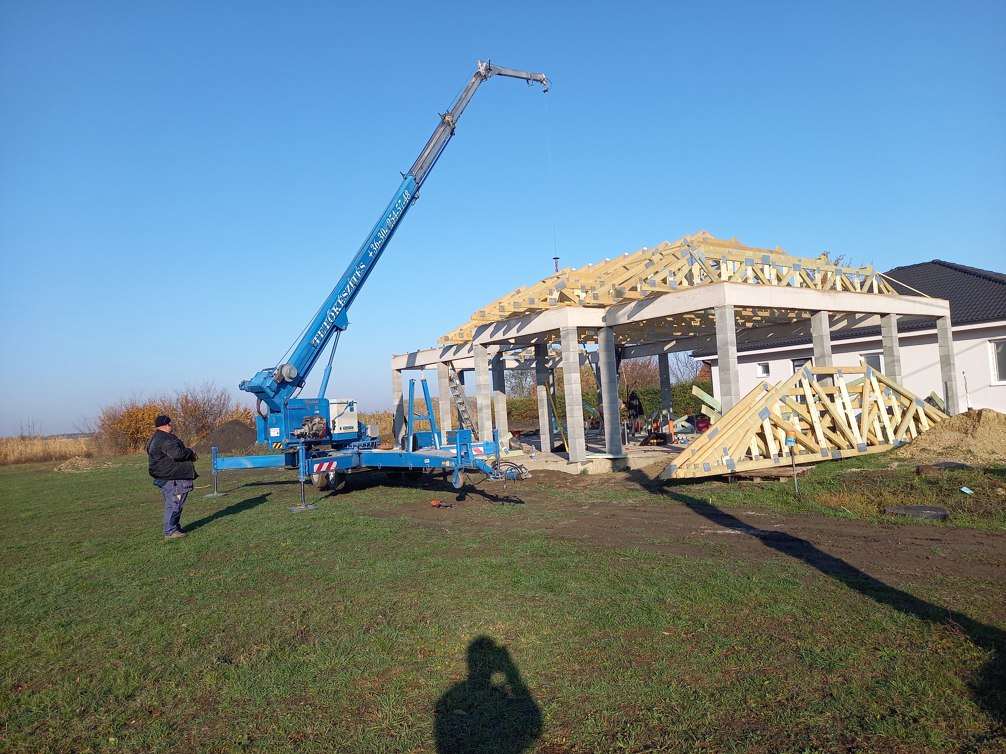 A tető a váz elkészítését követően felkerül a koszorúra a cserepekkel együtt, így a további munkálatok esőtől védve zajlanak.