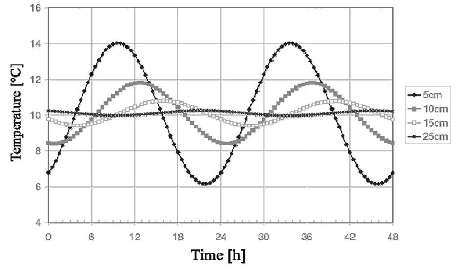 Nyáron ugyanez a jelenség csak fordítva, ugyanis a csak hőszigeteléssel rendelkező épület nagyon hamar felmelegszik, ezzel szemben a nagy hőtároló képességű épület klíma nélkül is hűvös marad. Minél nagyobb a hőtároló tömege az épületnek, annál később melegszik át a fal. A régi vastag falú paraszti vályogházak esetében ez a hőtömeg olyan nagy volt, hogy mire felmelegedett volna addigra már jött az ősz, így nem lett meleg a ház belsejében. Manapság nem ritka a nyári 40 °C fok feletti hőmérséklet, amikor minden hőszigetelés és hőtároló tömeg nélküli épület felforrósodik.